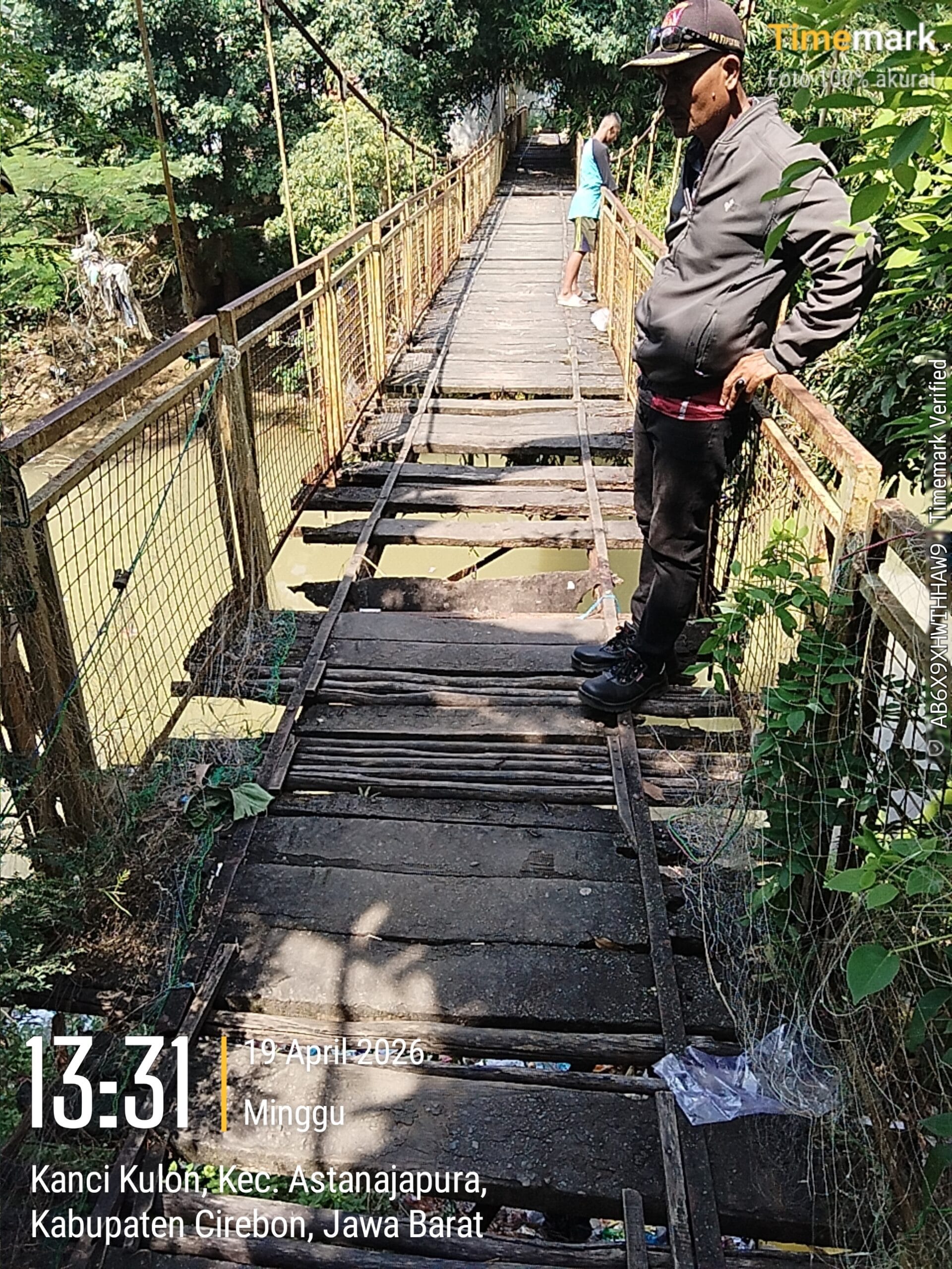Cirebon, 19 April 2026 — Kondisi jembatan gantung yang berada di Desa Kanci Kulon, Kecamatan Astanajapura, Kabupaten Cirebon, kini memprihatinkan dan dinilai membahayakan keselamatan warga. Dari pantauan di lapangan, sejumlah papan lantai jembatan terlihat lapuk, berlubang, serta rangka besi yang mulai berkarat, sehingga berpotensi menimbulkan kecelakaan bagi pengguna yang melintas.