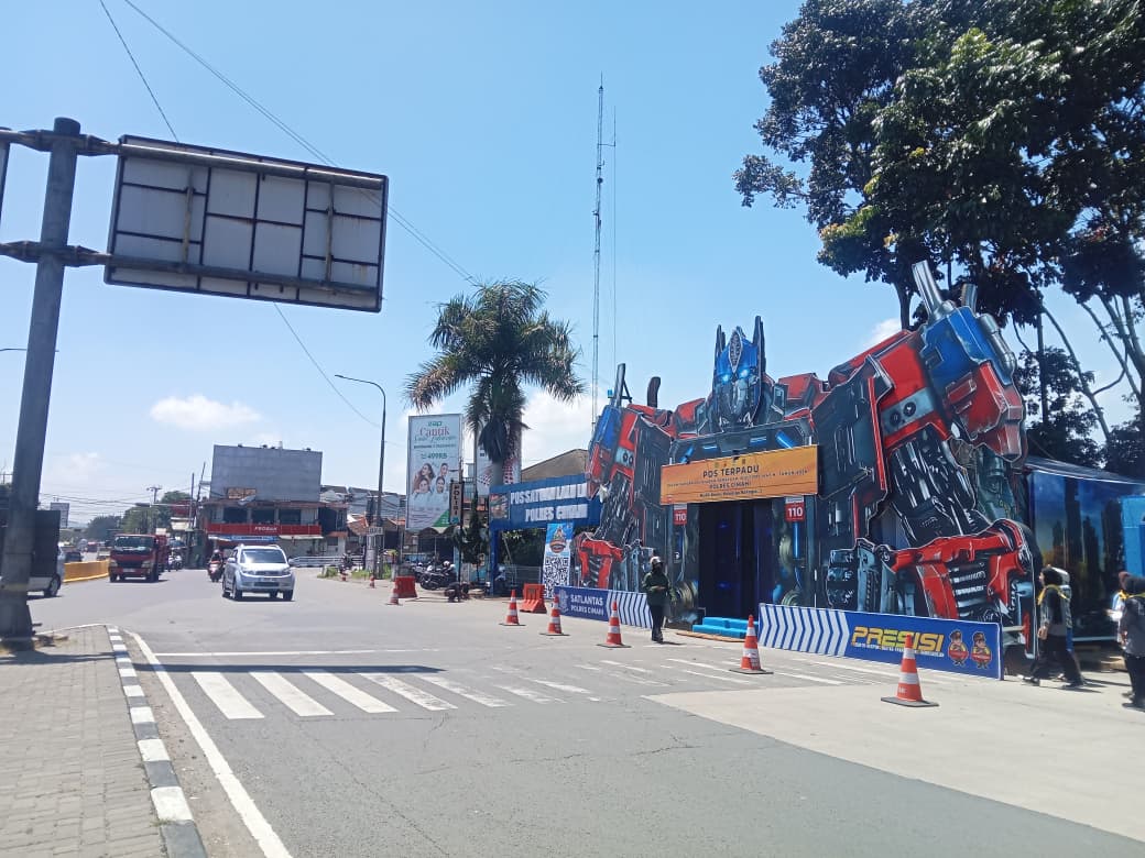 Inovasi pelayanan arus mudik Lebaran 2026 ditunjukkan Polres Cimahi melalui kehadiran Pos Terpadu bertema Transformers di Pos Utama pintu Tol Padalarang, Kabupaten Bandung Barat (KBB), Jawa Barat.